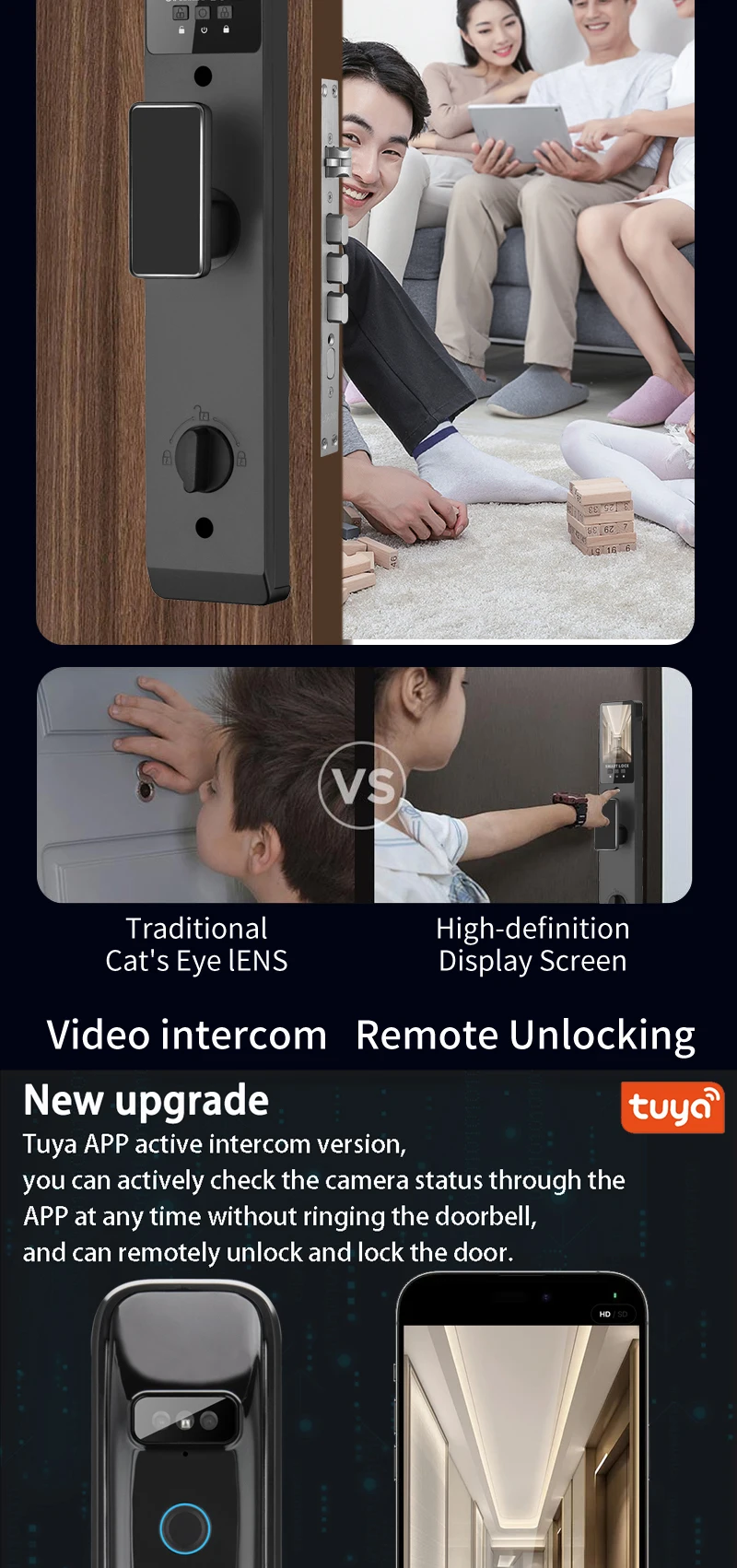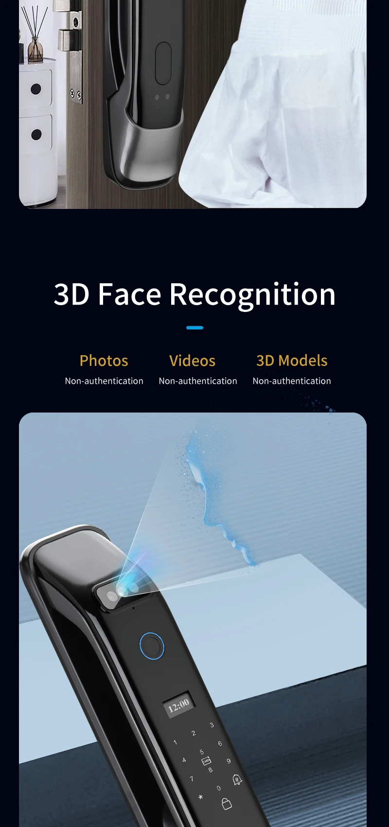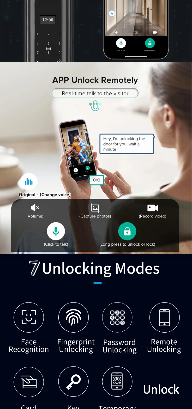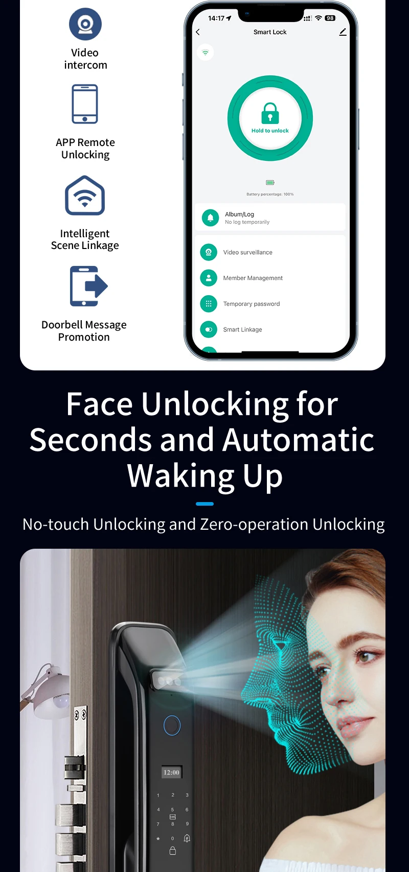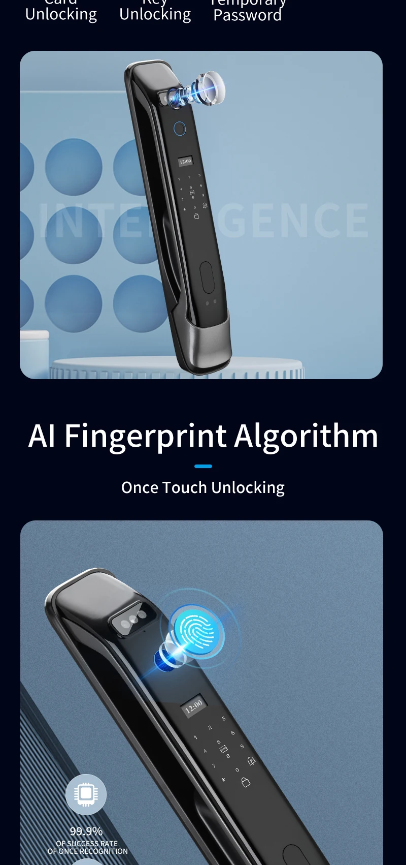 1.Opções de desbloqueio multimodo: Esta fechadura inteligente oferece métodos de acesso versáteis, incluindo reconhecimento facial, senha, impressão digital, cartão, chave e senha temporária, garantindo uma entrada segura e conveniente para os usuários.