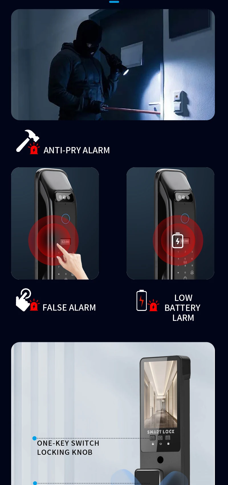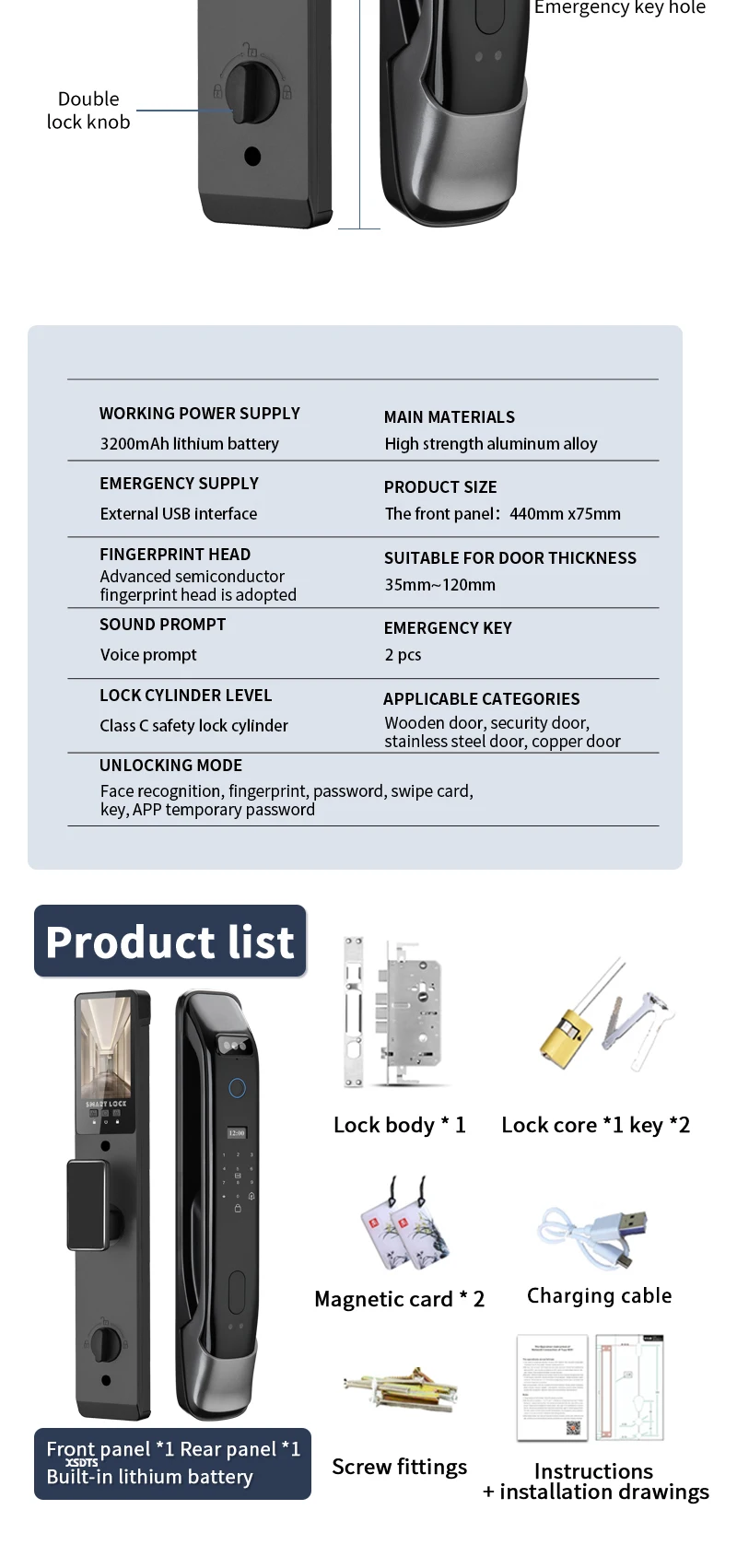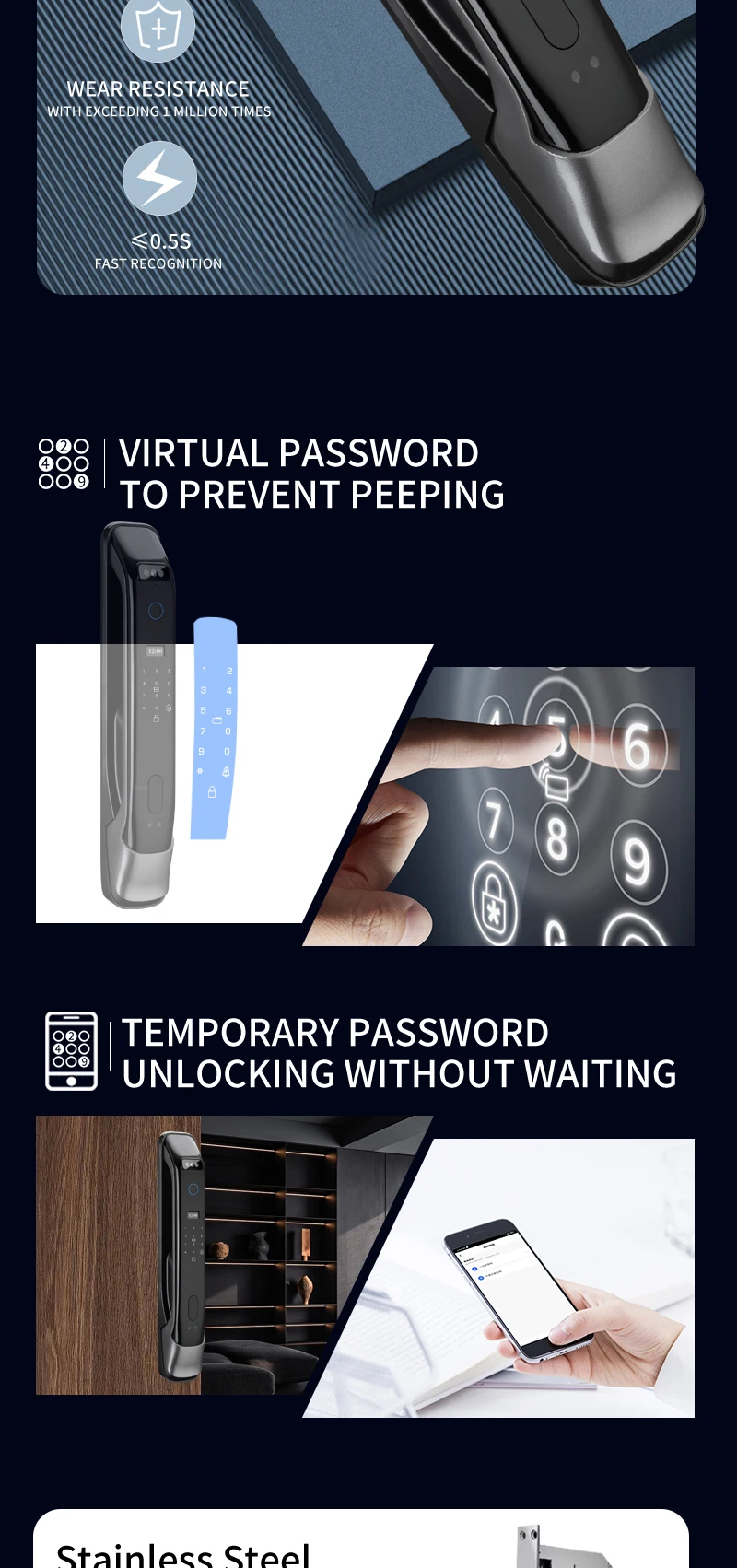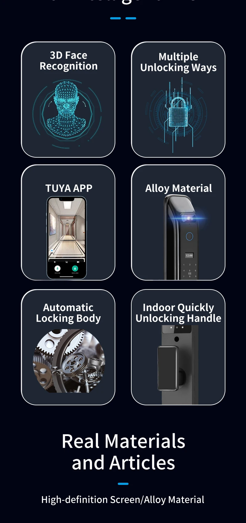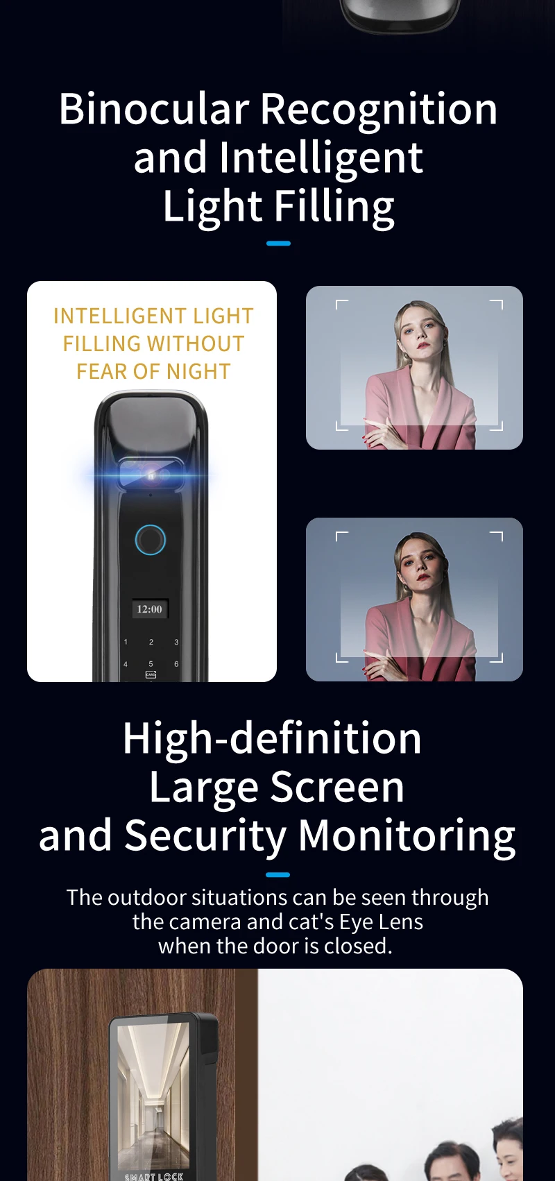 1.Opções de desbloqueio multimodo: Esta fechadura inteligente oferece métodos de acesso versáteis, incluindo reconhecimento facial, senha, impressão digital, cartão, chave e senha temporária, garantindo uma entrada segura e conveniente para os usuários.