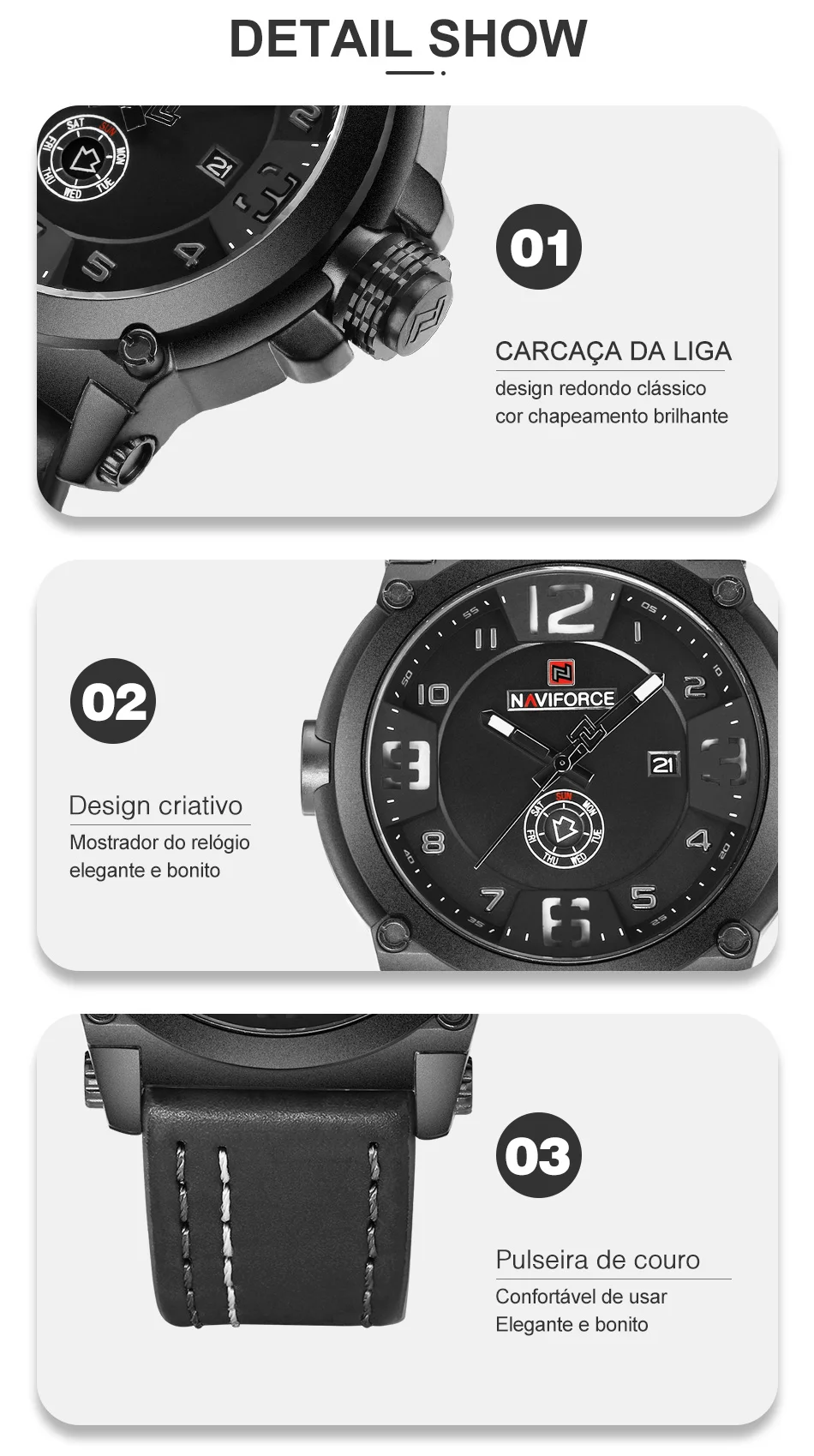 **Estilo e Função em um Só Produto**: O Naviforce é a fusão perfeita entre estética e funcionalidade, oferecendo tudo o que você espera de um relógio de luxo - precisão, durabilidade e um design que chama a atenção.