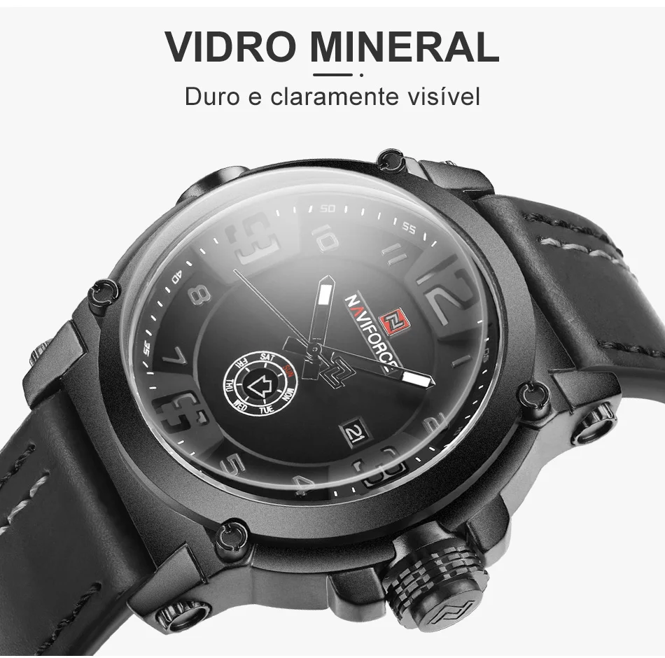 2. **Movimento de Quartzo de Alta Precisão**: Com mecanismo de quartzo avançado, o Naviforce garante precisão no horário, mantendo você sempre pontual e no controle. Ideal para aqueles que valorizam o tempo e a confiabilidade.