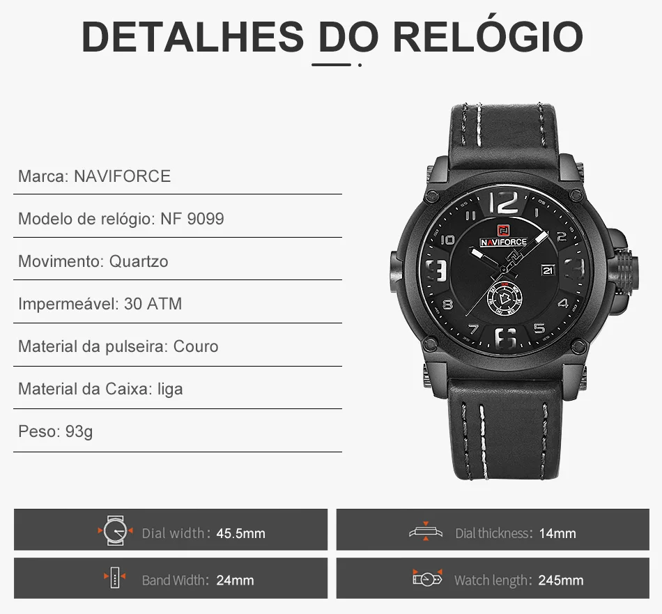- **Versatilidade em Qualquer Ocasião**: Perfeito para eventos formais, trabalho, encontros casuais e aventuras esportivas, o Naviforce é o acessório que se adapta ao seu dia a dia, tornando seu visual único e sofisticado.