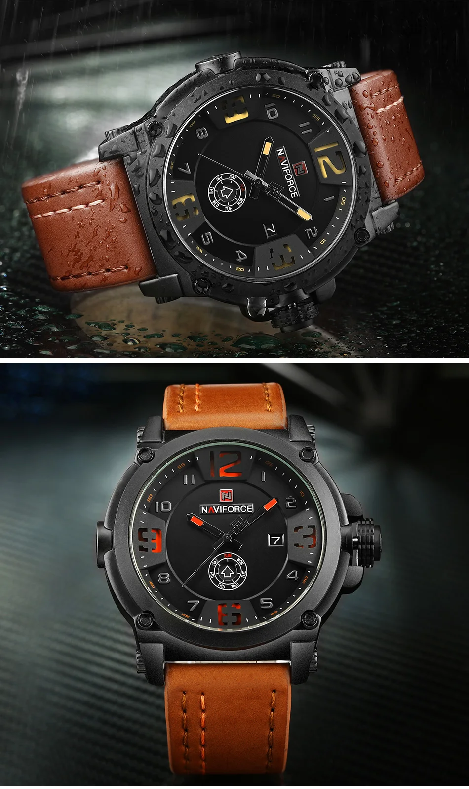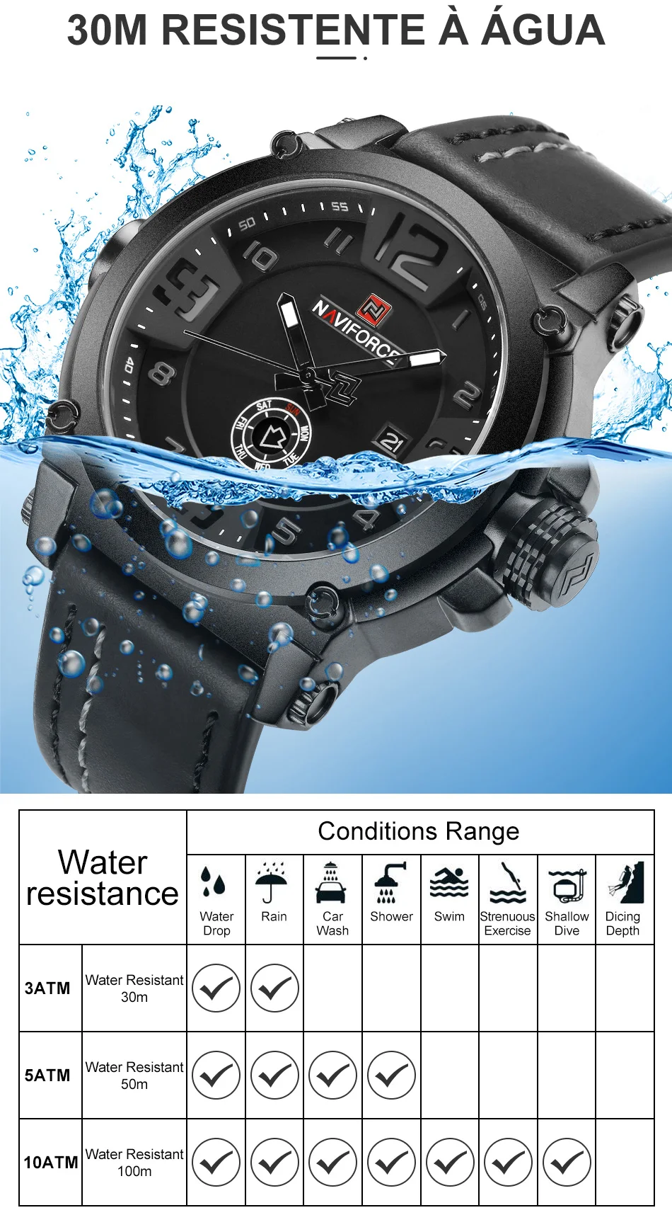 4. **Resistente à Água**: Desenvolvido para homens ativos, o Naviforce possui resistência à água para suportar chuvas leves e respingos, perfeito para atividades ao ar livre e aventuras diárias sem preocupações. 🌧️