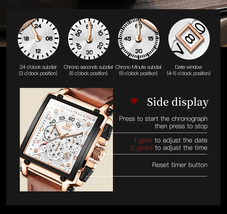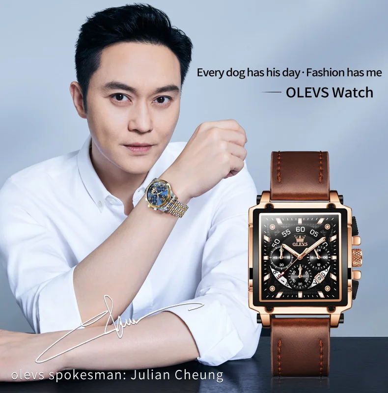 Com seu formato quadrado elegante, o OLEVS quebra a monotonia dos modelos tradicionais e traz um toque de originalidade ao seu visual. Ideal para quem busca se destacar com bom gosto.
