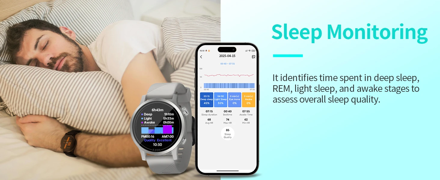 Mais do que um relógio, o Ezon R7 é um assistente pessoal de bem-estar. Ele monitora batimentos cardíacos, calorias queimadas, níveis de oxigênio no sangue (SpO₂) e qualidade do sono, ajudando você a compreender melhor seu corpo e alcançar suas metas com eficiência.