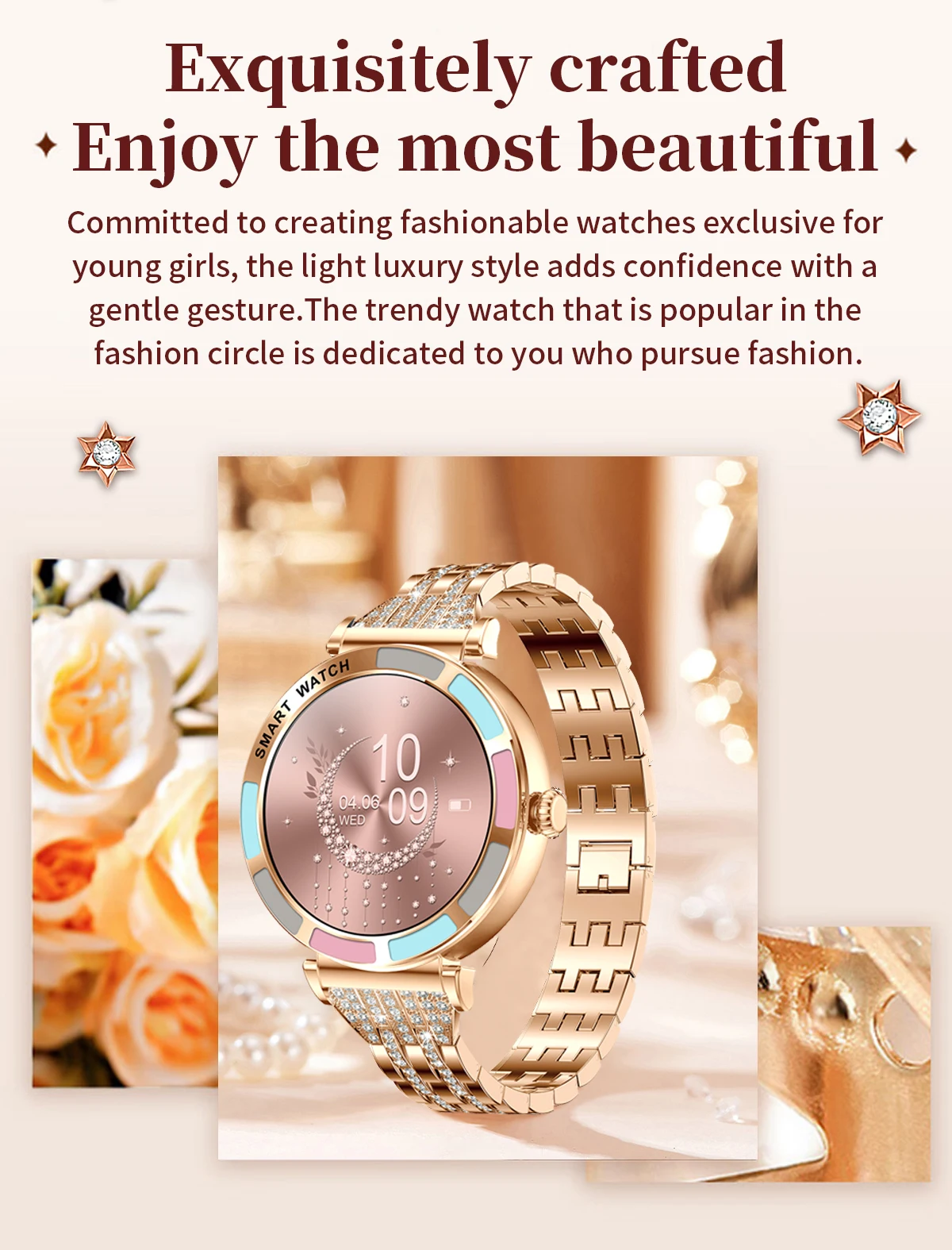 Você merece um acessório à altura da sua personalidade! Disponível em Prateado, Dourado, Gold Steel SI e Metal Ouro, este relógio inteligente foi criado para mulheres exigentes, que não abrem mão de elegância — nem de conectividade.